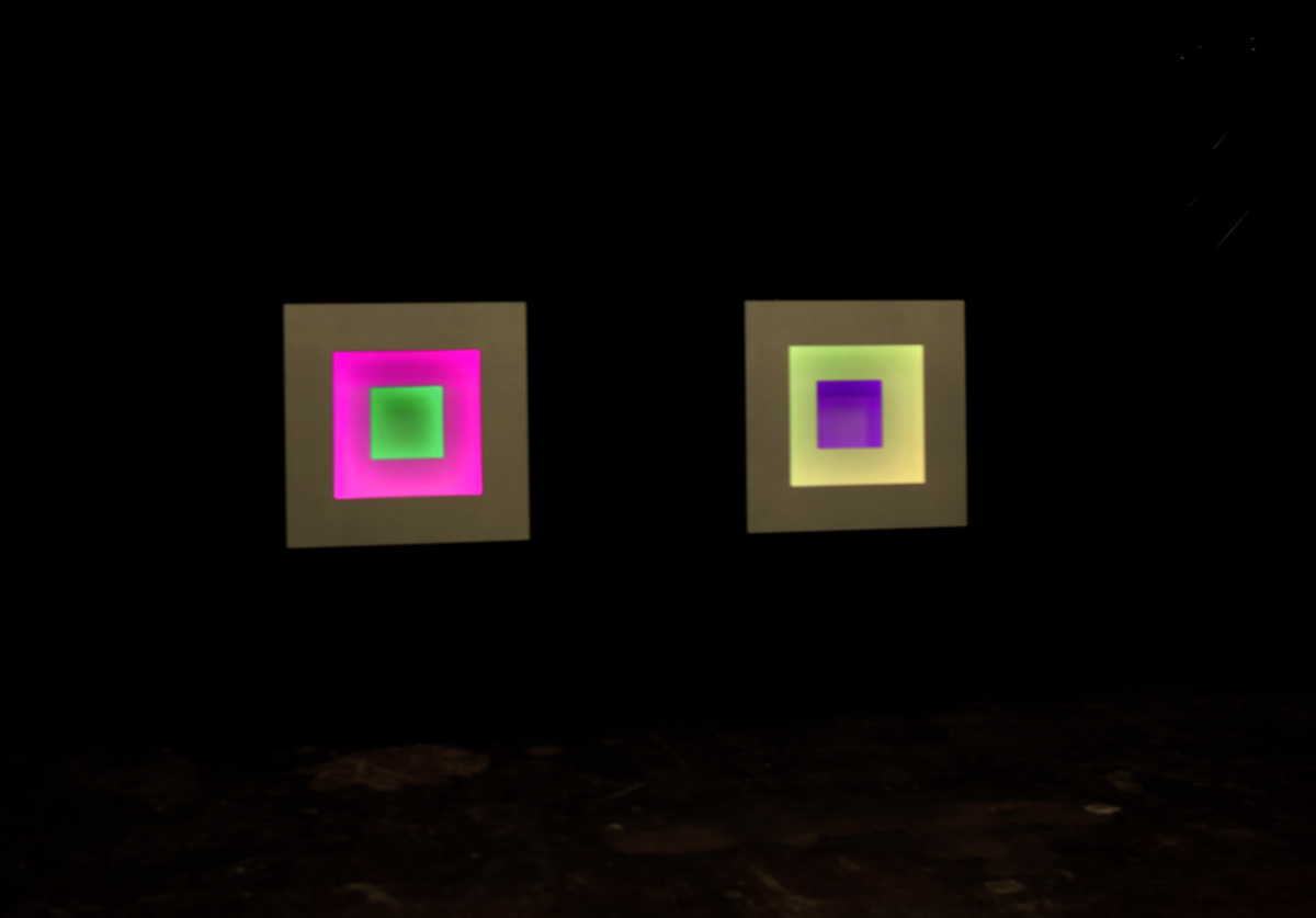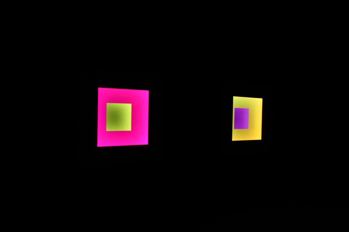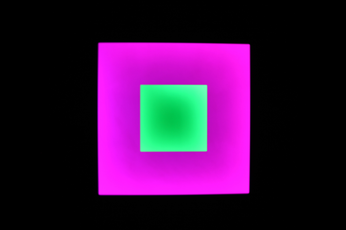 In the work the artists main focus has been the observation of the symbiosis of different colours. The usage of complementary colours, opponent colours and afterimages throughout the visible wavelengths of light, alter our perception towards something wider than what actually is in front of us. The piece strives towards a pure representation of colour, detached from the surface, spacer or other context that usually distract our seeing. The colour is brought forward in its most natural form as light, that as colour is in relation to itself and its surroundings.
